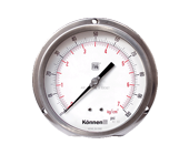 MGS18/A/150 Diametro: 6” (150 mm) Clase: 1% Conexión: Inferior de ½” NPT en inoxidable Internos: Tubo bourdon y mecanismos en AISI 316 Visor: Cristal Templado Rangos Disponibles: (Kg/Cm2-psi) De 0/0,6-75 a 0/1000-15000. Escala de vacuometro (Kg/cm2 - Pulg. Hg) -1 - 30/0. -1 + 15 y -1 + 24 NH3 Apto para baño de glicerina |